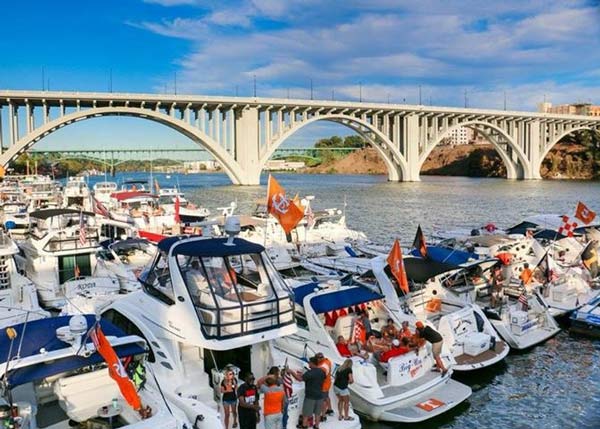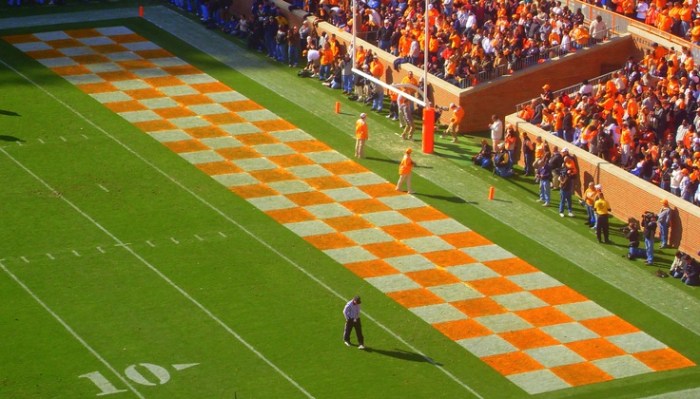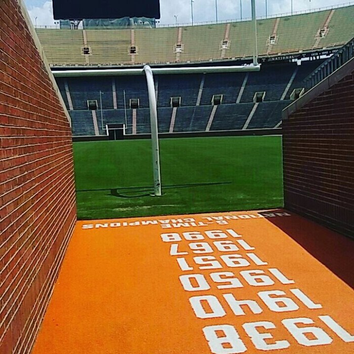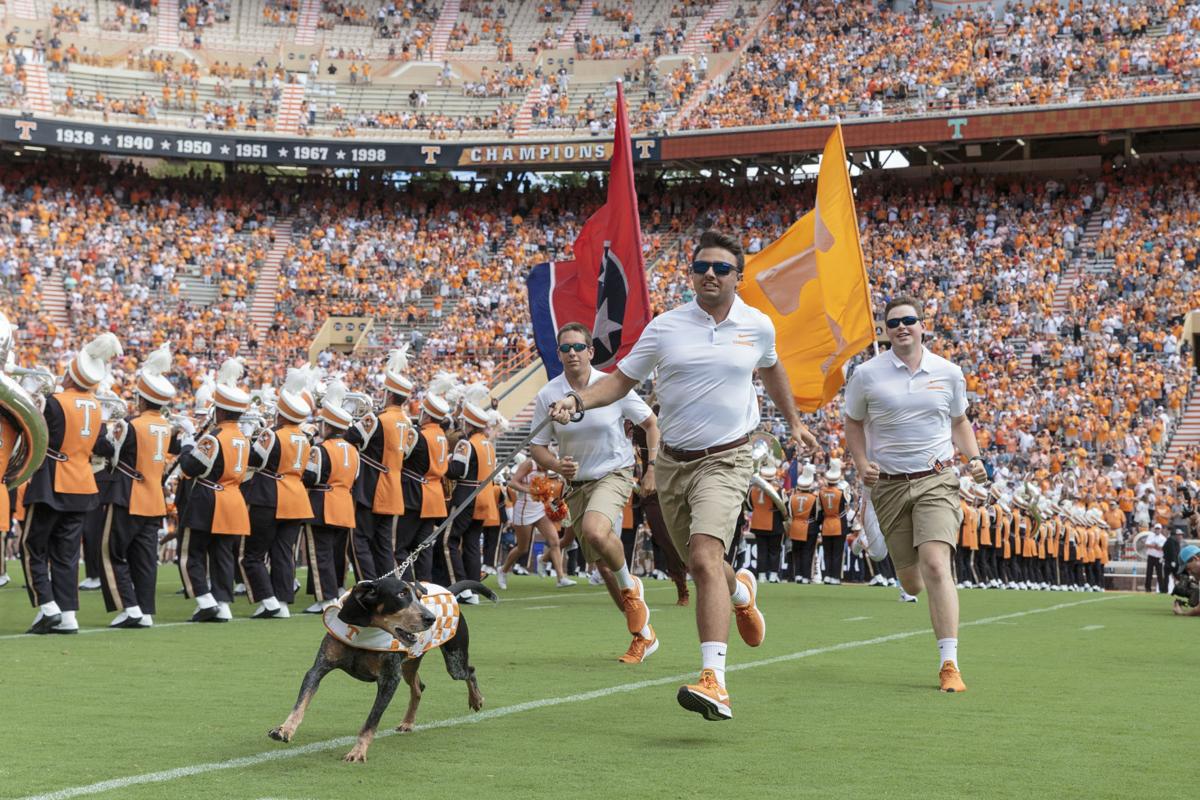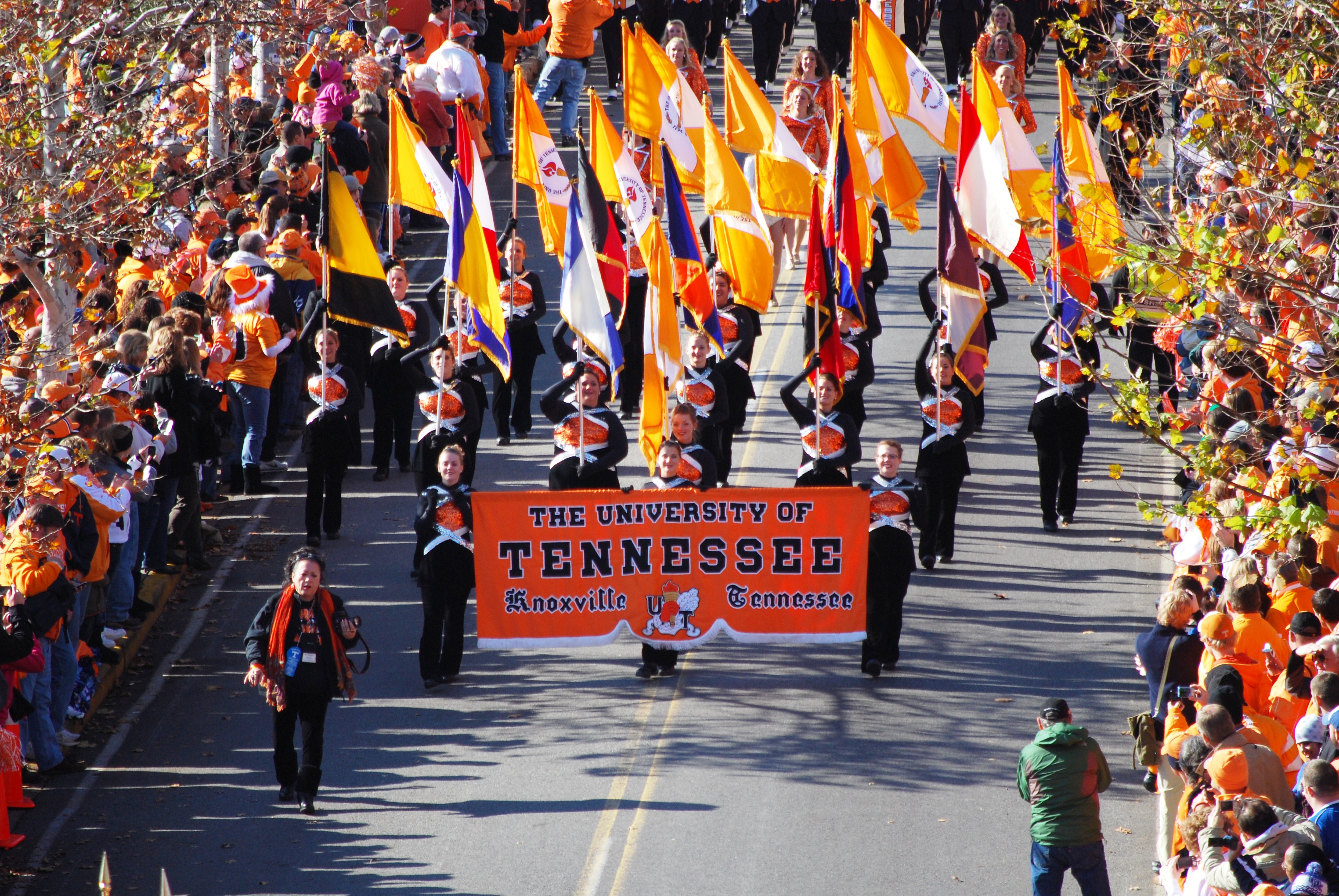 Of course, Tennessee has traditions, much like any other campus, and these traditions are a big part of what makes Saturday’s in Knoxville what they are. On game days there is a tangible electricity in the air that builds until kick-off. It starts with the excitement of the Vol Walk and the Pride of the Southland parade through campus, grows as you sail-gate with the Vol Navy on the Tennessee, builds as you join the sea of fans clad in orange and white, intensifies with the pre-game show from the Pride of the Southland band and every time you hear Rocky Top, bubbles up with the Vol Football team being lead through the T by Smokey, and culminates with the kick-off fireworks and feeling Neyland begin to rock. Now it is officially, FOOTBALL TIME IN TENNESSEE!